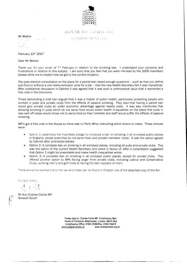 Reply from Charles Clarke MP for Norwich South to my letter querying this: