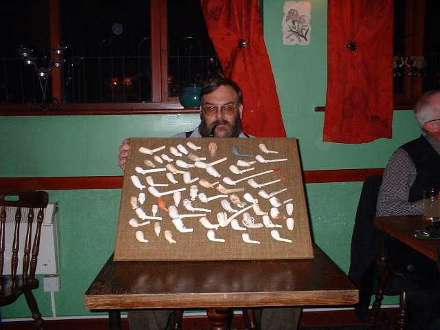 | Colin Wylie (right), winner of the 2005 Clay competition, receives his prize of a Parker pipe from PCN chairman Len Ellis. |