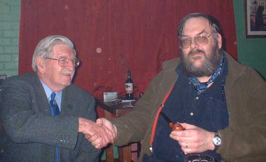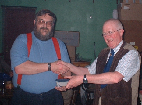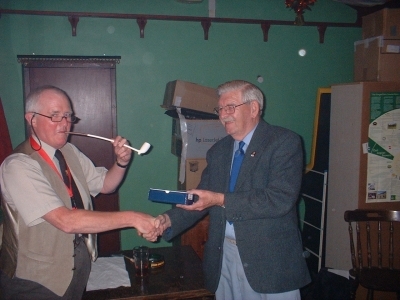 Here the winner, Richard Adamek (time 1hr 19mins), receives his prize of a Cadogan pipe from Reg Walker.