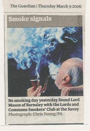 The so-called 'No Smoking Day' seemed to have no impact in Norwich as far as I could see- I only knew about it when I read today's Guardian, which contained a picture of the Parliamentary Saint of Smoking (John Betts and I met him many years ago when we were invited to a House of Lords and Commons Smoking Club meeting in London). The biography is from a 1989 edition of Vacher's Biographical Guide- good to see he is still puffing.