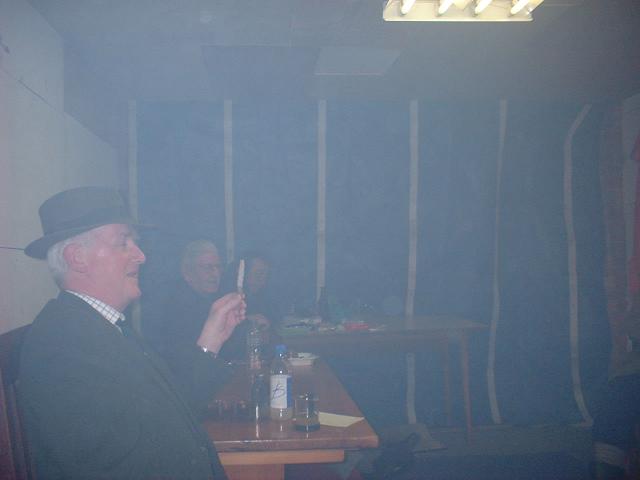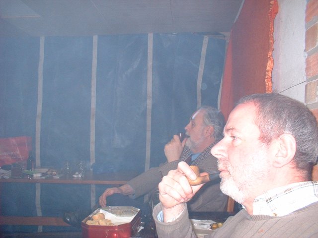 The annual four grammes contest was held smoking Royal Champagne in pipes of the contestants' choice. Good times were recorded with the Secretary, being the only one not to last more than 50 minutes: and that was due to his weak bladder (too much to hope that the pipe would still be alight on returning from the toilet). A typist writes - perhaps the Secretary would be well advised to contact Mr Sethia at the NNUH - and take his own Marigold gloves. It only takes a second, and they give you a pipe to bite on...