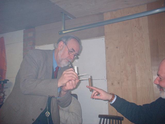 A clay pipe smoking contest smoking 3 grams of Samuel Gawith's Scotch Cut Mixture in a variety of strange shaped clays. True to form John Elvin was first out in 2:11, but surprise surprise Len Ellis was next to go after 6:15. John Walker eventually finished runner up with 37:33 leaving Keith Coleman with his first ever clay pipe victory in 40:35. Keith was presented with a Churchwarden pipe and sandwiches rounded off a good evening.